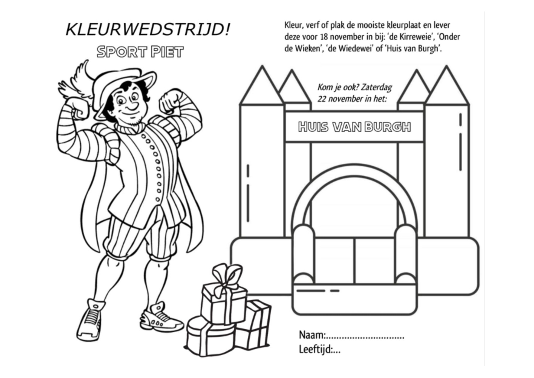 Kleur, verf of plak de mooiste kleurplaat en lever deze vóór 18 november in bij ‘de Kirreweie’, ‘Onder de Wieken’, ‘de Wiedewei’ of ‘Huis van Burgh’.